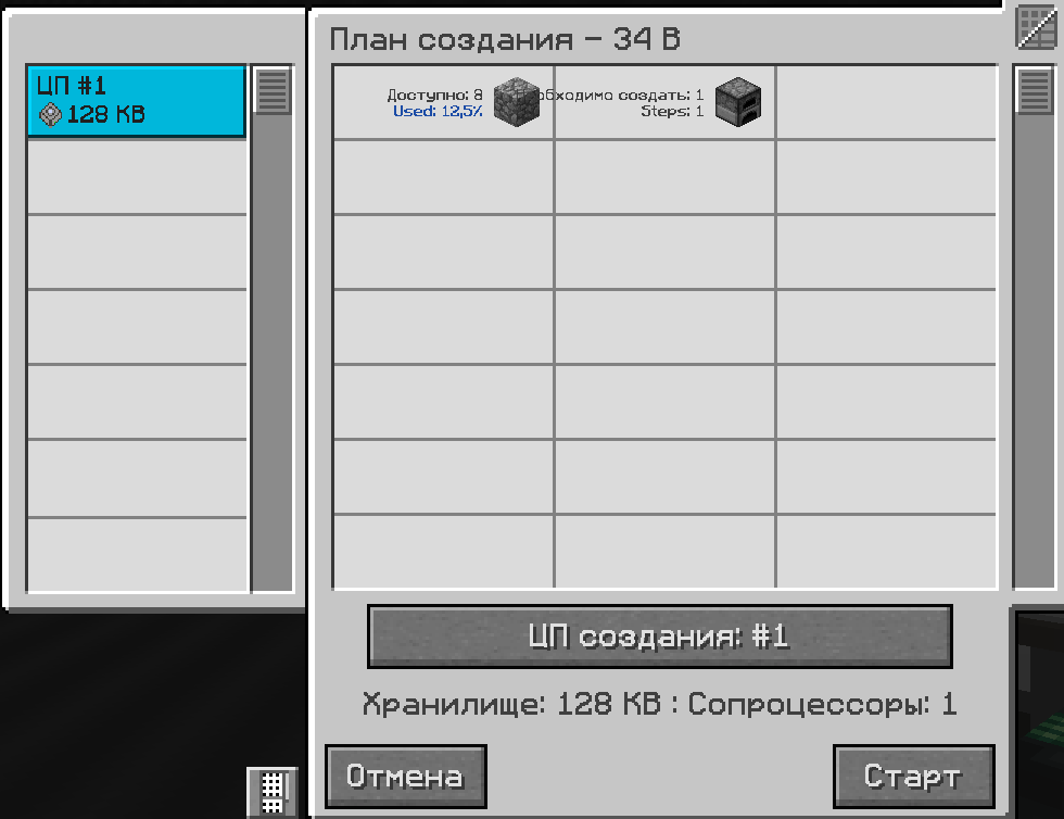 МЭ интерфейс слева поставляет блоки красного камня, а интерфейс справа осмиевые слитки. В обоих интерфейсах установлена карта создания, которая будет запускать автокрафт ресурсов, если они закончатся.