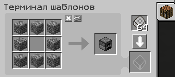 Например, создадим шаблон крафта печи. Откроем терминал шаблонов, выложим крафт печи в сетке крафта и нажмем "Закодировать шаблон". После готовый шаблон кладём в МЭ интерфейс.