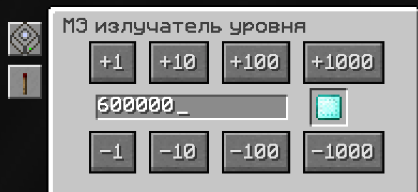 Далее открыть интерфейс излучателя уровня, выставить нужный предмет и количество, в нашем случае сжатый алмаз. Также настроить режим красного камня на "ниже предела"(кнопка слева).&#x20;
