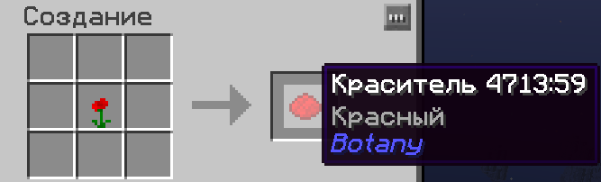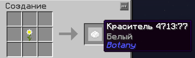 Далее ставим на почву любой нужный вам ванильный цветок и он преобразуется в цветок из мода Botany.  Ломаем его и кладём в ячейку создания, чтобы получить краситель.